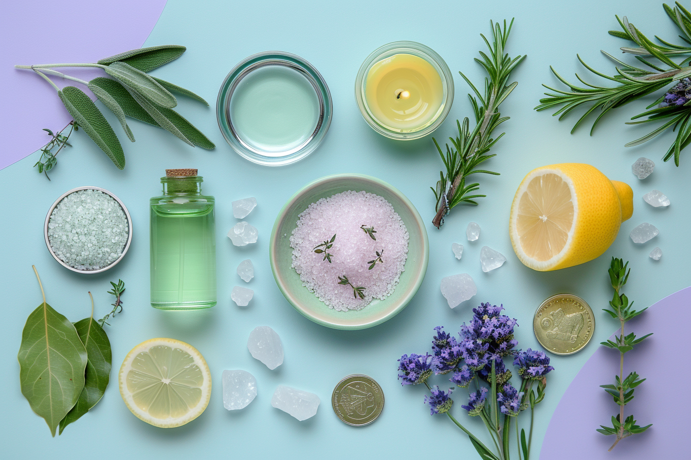 Salt, vinegar or lemon, rosemary, bay leaves, cinnamon, white/black/green candles, a coin (£1/£2), a glass bowl/jar, journal + pen, selenite/clear quartz/black tourmaline (optional).